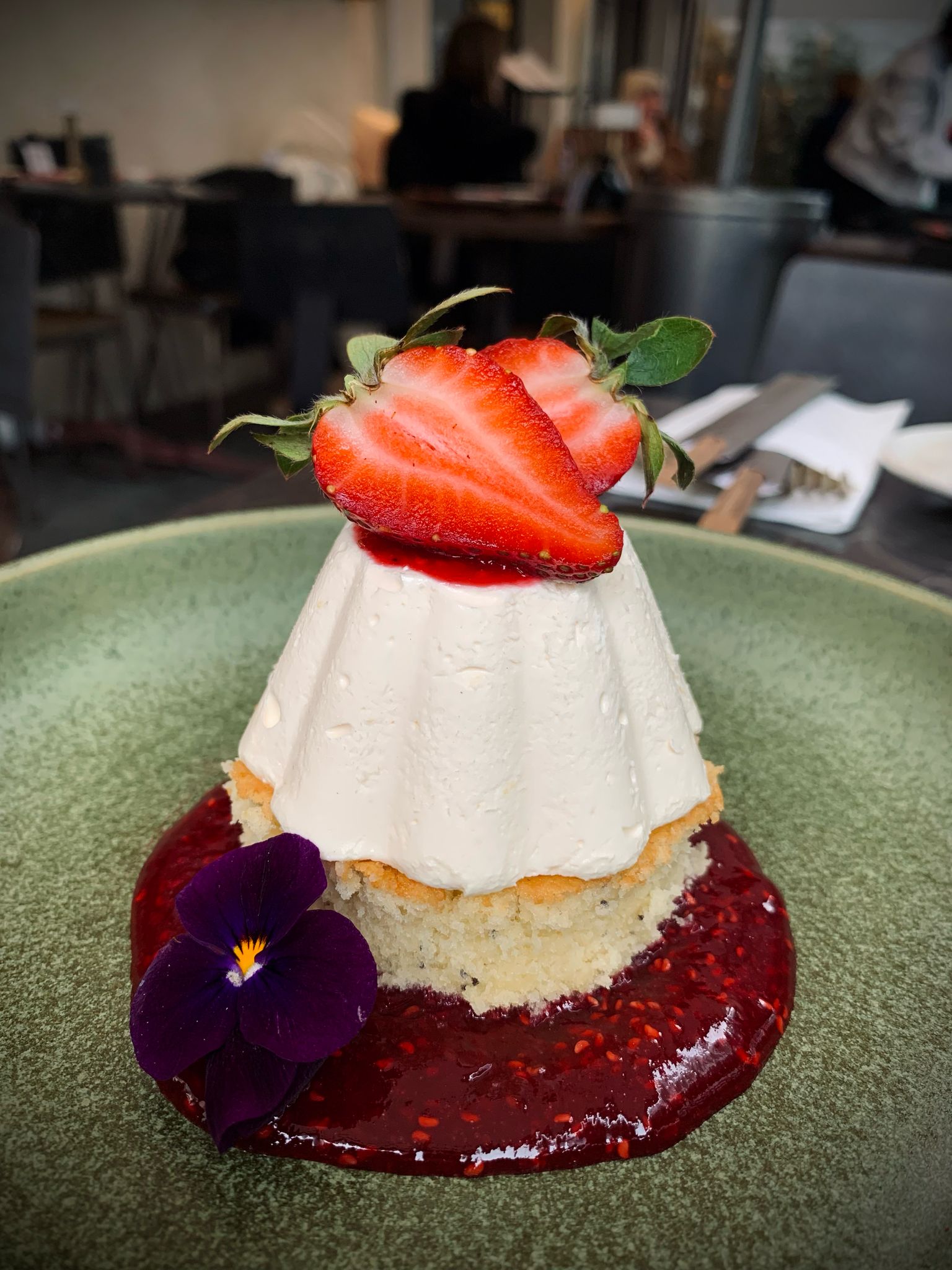 Süzme Yoğurtlu Mus,Yuzu ve Mavi Haşhaşlı Sponge , Frambuaz Sos ile./ Greek Yoghurt Mousse, Yuzu and Blue Poppy Seed Sponge with Raspberry Sauce.